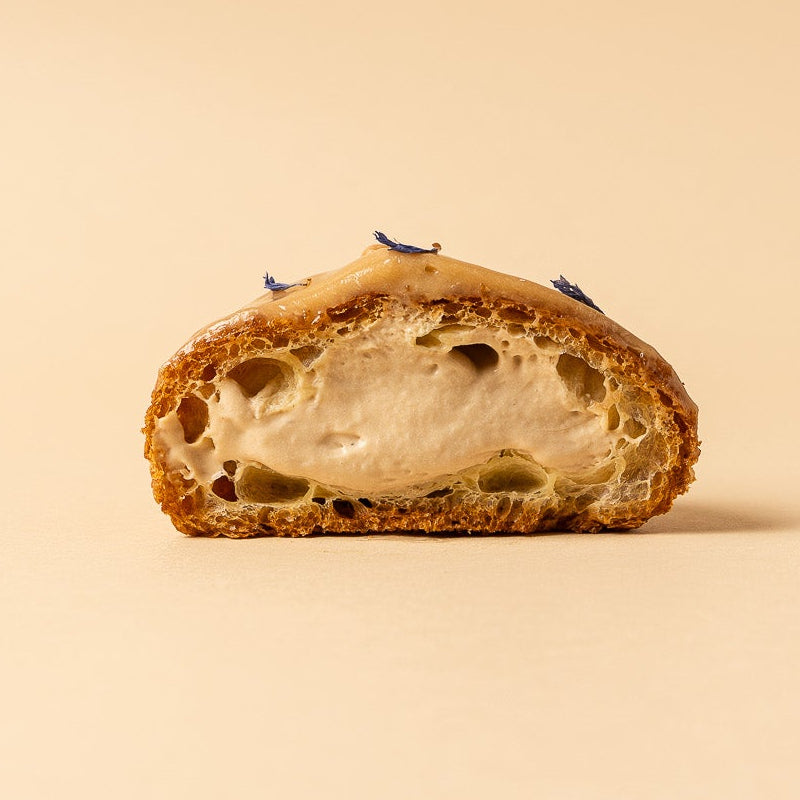 Crema de té Earl Grey, glaseado de chocolate blanco tostado, aciano deshidratado y perlas de caramelo, choux crujiente