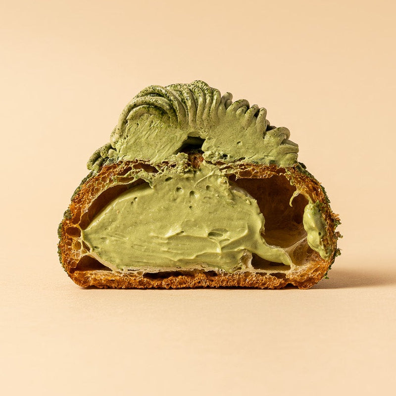Matcha cream, matcha whipped ganache, sweet matcha powder, crispy choux