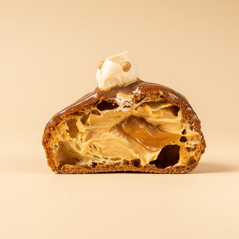 Salted caramel cream, caramel sauce, caramel chocolate glaze, caramelized white chocolate whipped ganache, crispy choux